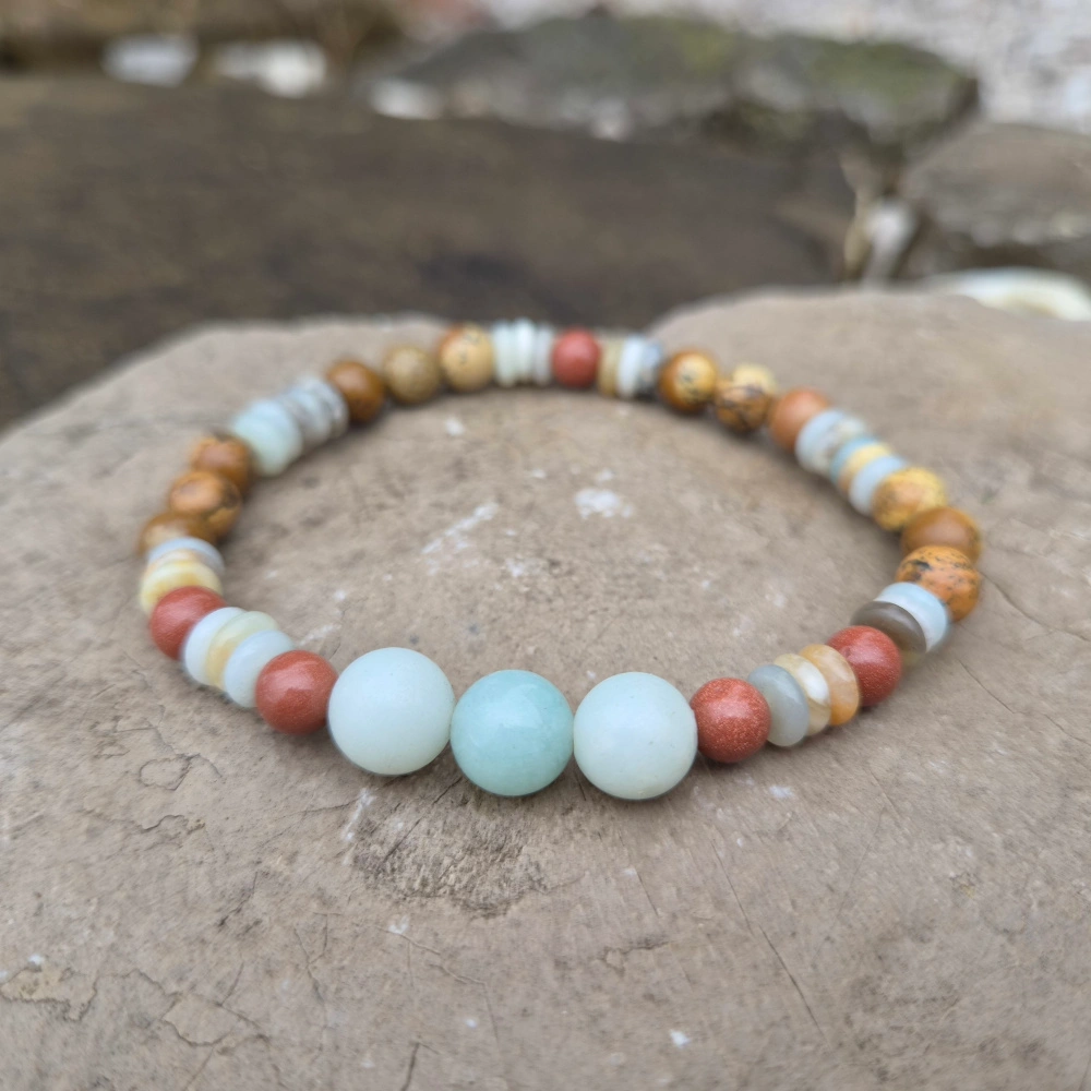 Kristali: Amazonit za več moči, poguma in resnice. Jaspis za mirnost in prisotnost v trenutku. Zlati kamen za kanček sreče.