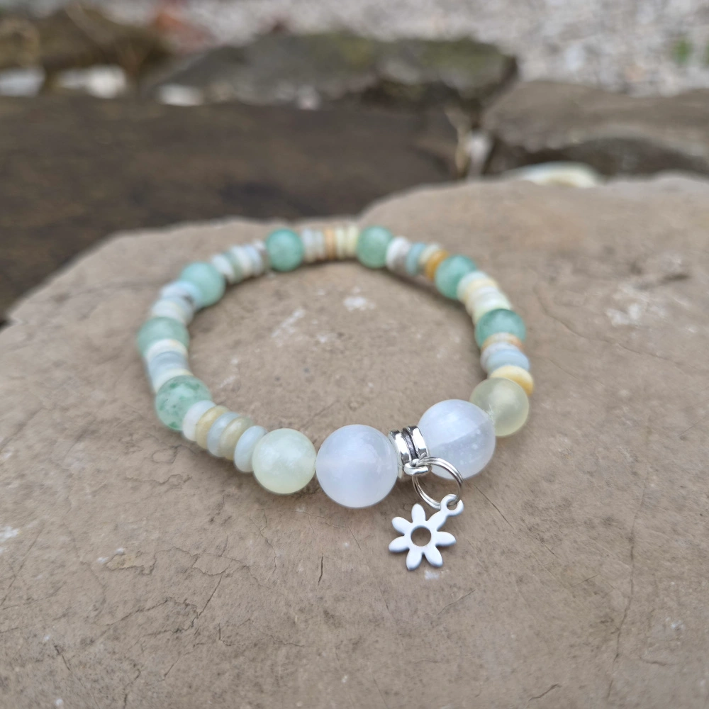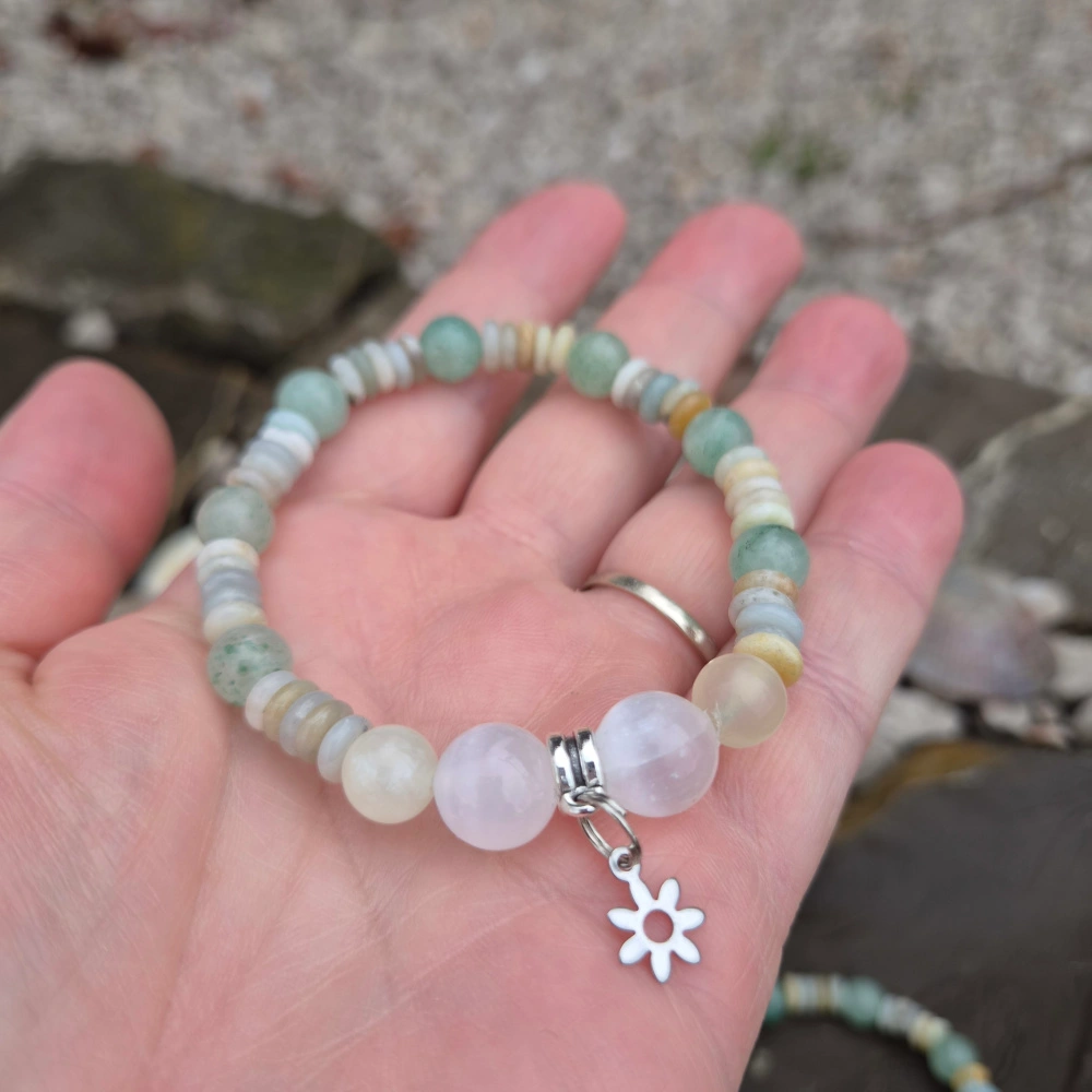 Kristali: Amazonit za več moči, poguma in resnice. Selenit za notranjo mirnost in jasnost intuicije. Kalcit za pretočnost. Aventurin za kanček sreče.